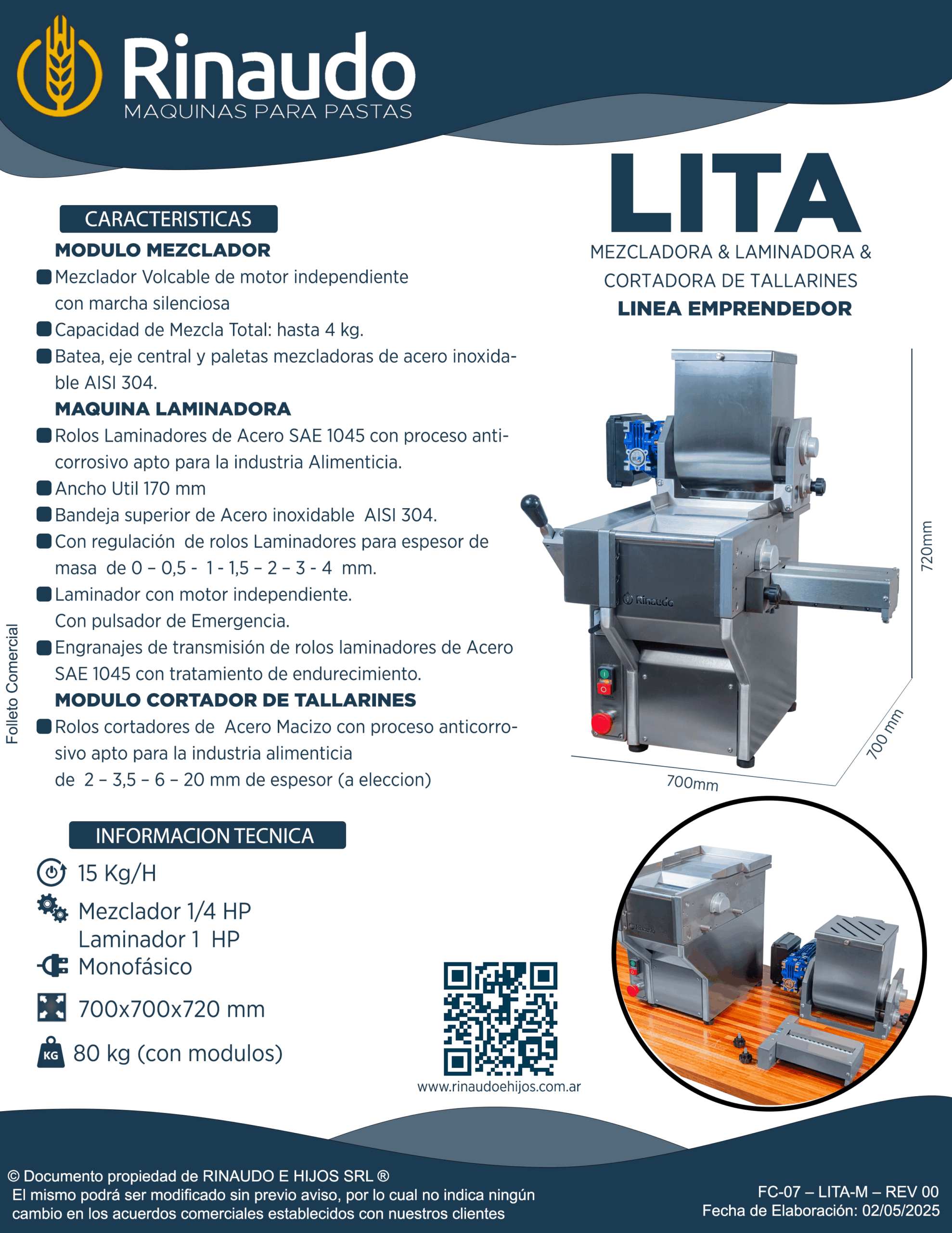 - Producción: 15 kg/h, ideal para emprendimientos, cocinas chicas y primeras ventas.